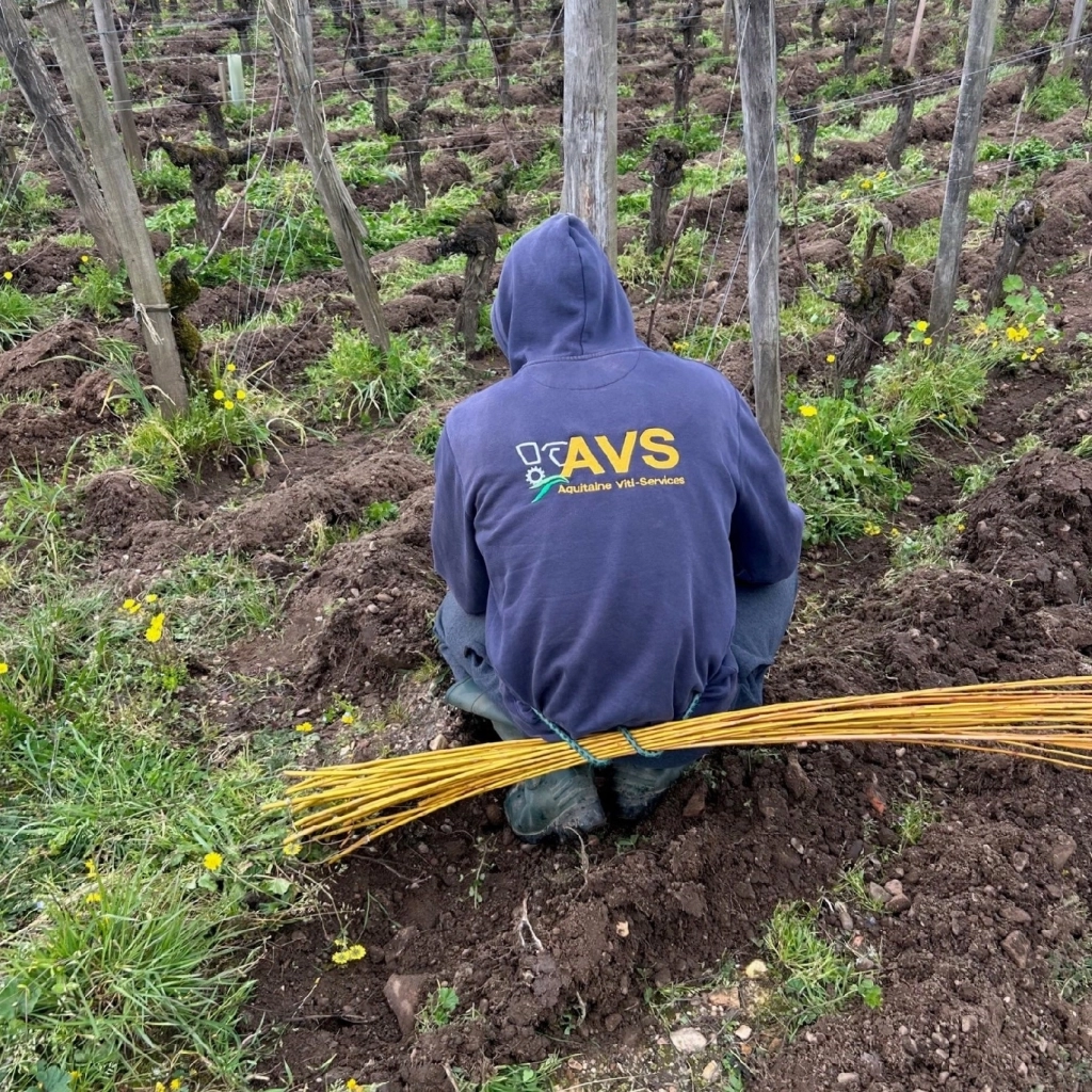 Nos équipes AVS réalisent ici un calage de vigne dans une parcelle à Pomerol.